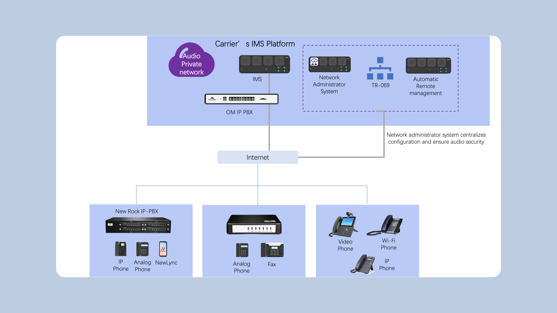 The New Rock OM series IP PBX and MX series of VoIP gateways, both of which support dual network ports, can therefore meet the above requirements.