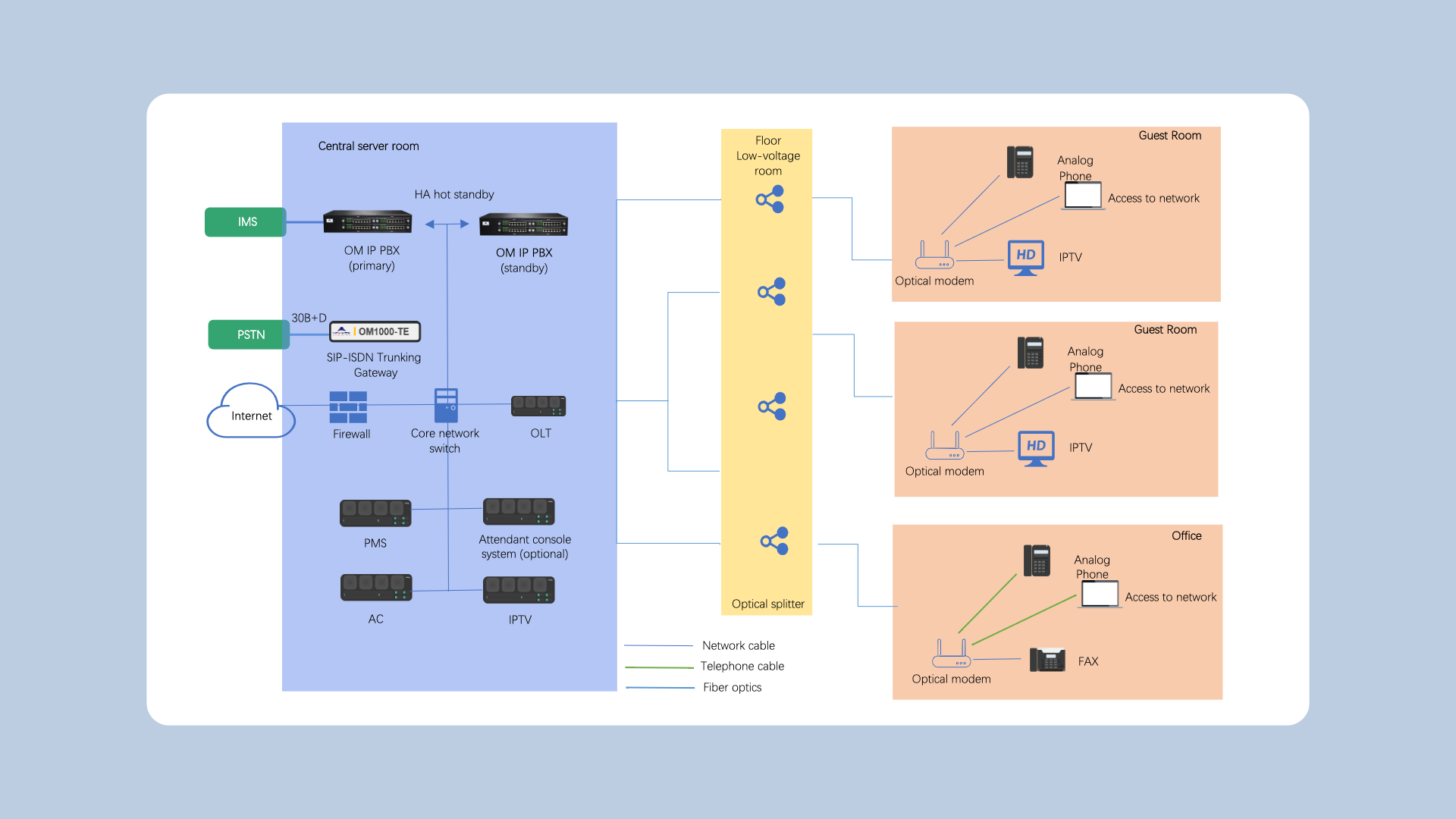 -ONU with voice port: Connected to an analog phone (ONU registered with the hotel’s OM IP-PBX through a fiber optic network) to unlock telephone functions in guest rooms