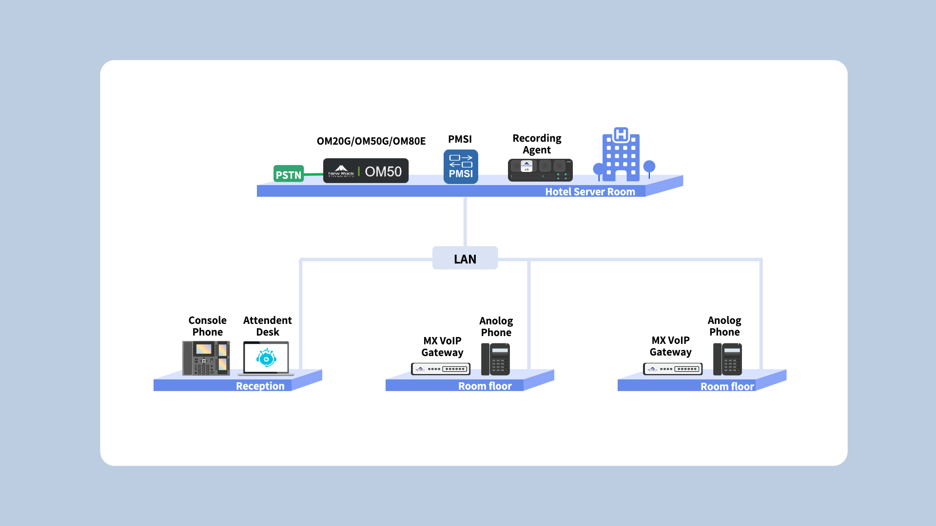 With New Rock OM series IP-PBX as the core component, with MX series VoIP gateway distributed deployment on the hotel room floor, and PMSI docking with hotel PMS, New Rock provides small and medium-sized hotels with an economical and practical unified communication solution.