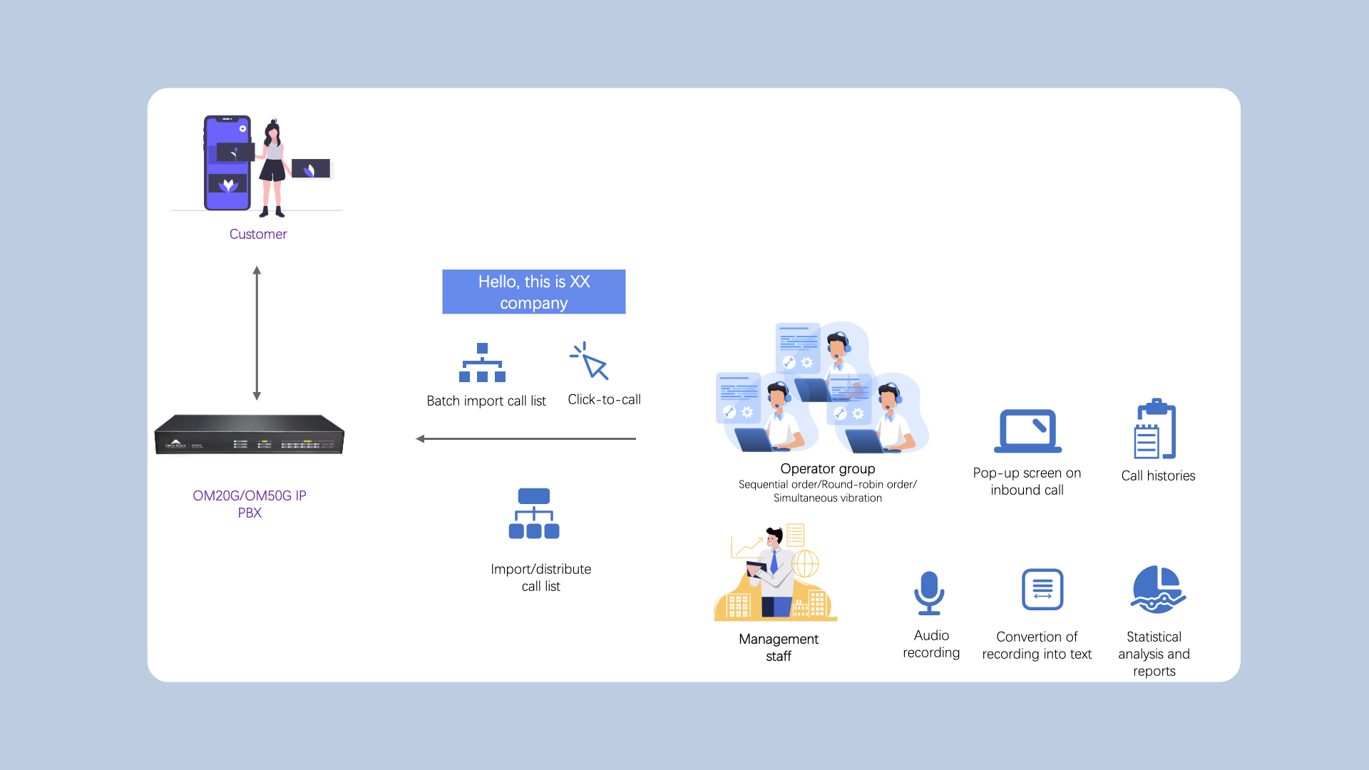 With the New Rock telemarketing-type call center solution, telemarketers can conduct batch import of a call list. Dialing can be accomplished by simply clicking a list, thus improving calling efficiency and volume.