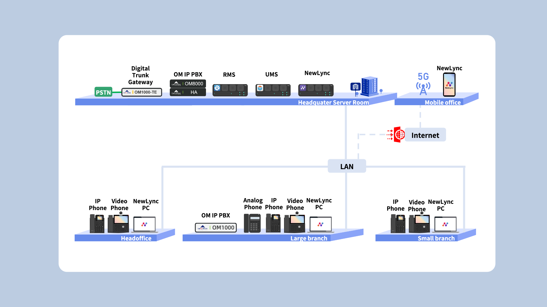 New Rock VoIP solution for the financial industry, take New Rock OM series IP-PBX as the core unified communication platform, adopt a unified management platform (UMS) for centralized operation and maintenance of equipment in the system, deploy a one-stop collaborative platform (Newlync) that has meetings, instant message and mobile extension function to realize unified communication in the financial industry.