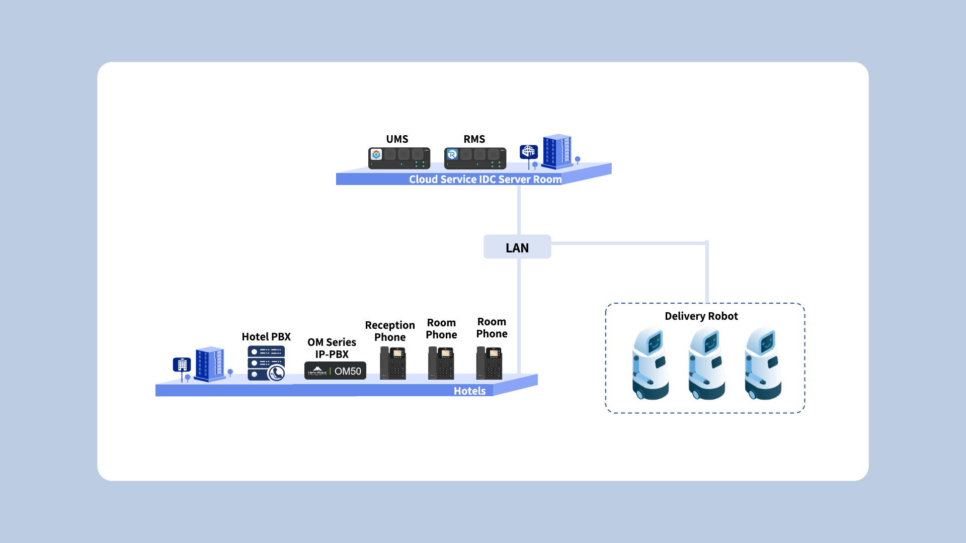 Along with rising labor costs, contactless delivery, and increasing intelligent demand, "errand delivery" robots are more and more widely used in various industries. New Rock IOT solutions help robot manufacturers to make their products communicate with users quickly and intelligently through VoIP applications. Application scenarios: telephone notification, play pickup code. Application value: use the robot SaaS cloud platform+ New Rock in-store OM IP PBX, New Rock NAT traversal service, use the hotel original phone extensions, to realize fast and convenient deployment, centralized operation and maintenance in the UMS cloud, hotel errand robot arrives at the designated location and needs to notify the guest room by telephone that the items have been delivered and inform the pickup code to pick up the goods. The process requires the robot to dock with the hotel's existing communication system and follow the instructions to complete the task.