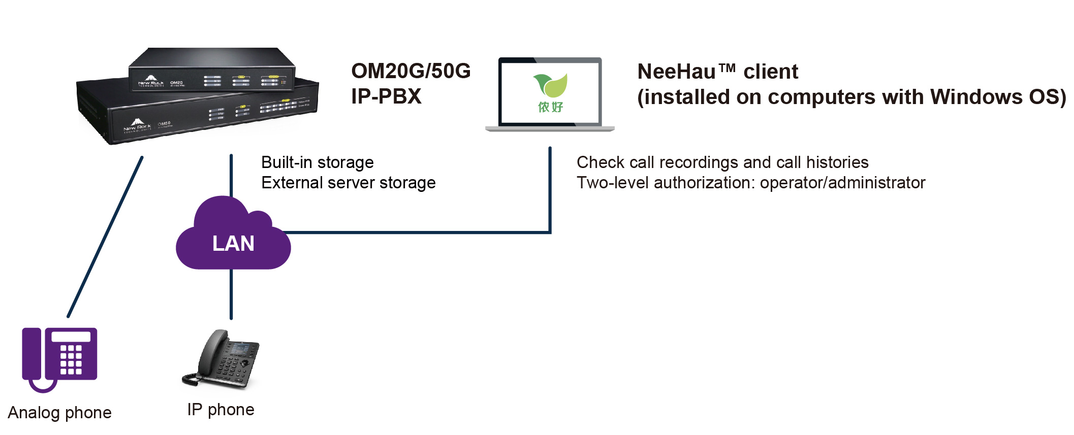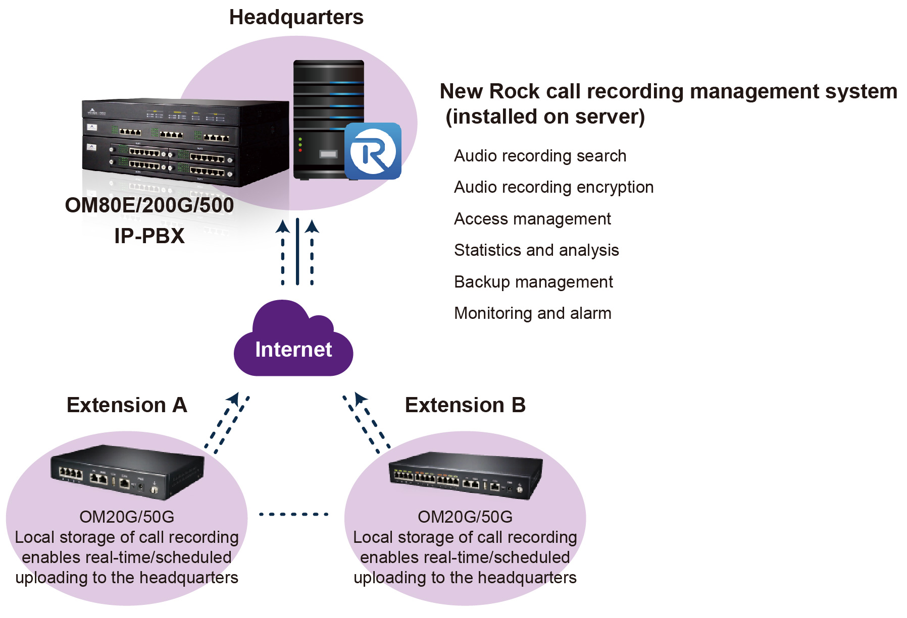 1.Distributed recording and centralized management: small OM IP-PBXs at branch offices, with built-in storage for call recording; medium to large OM IP-PBXs and New Rock recording management system at the headquarters for centralized management of call recordings at the headquarters and branch offices;