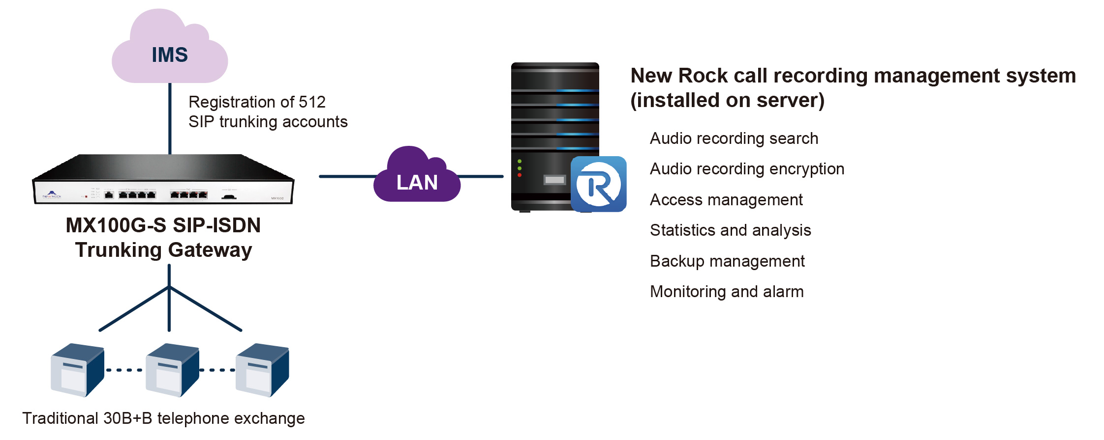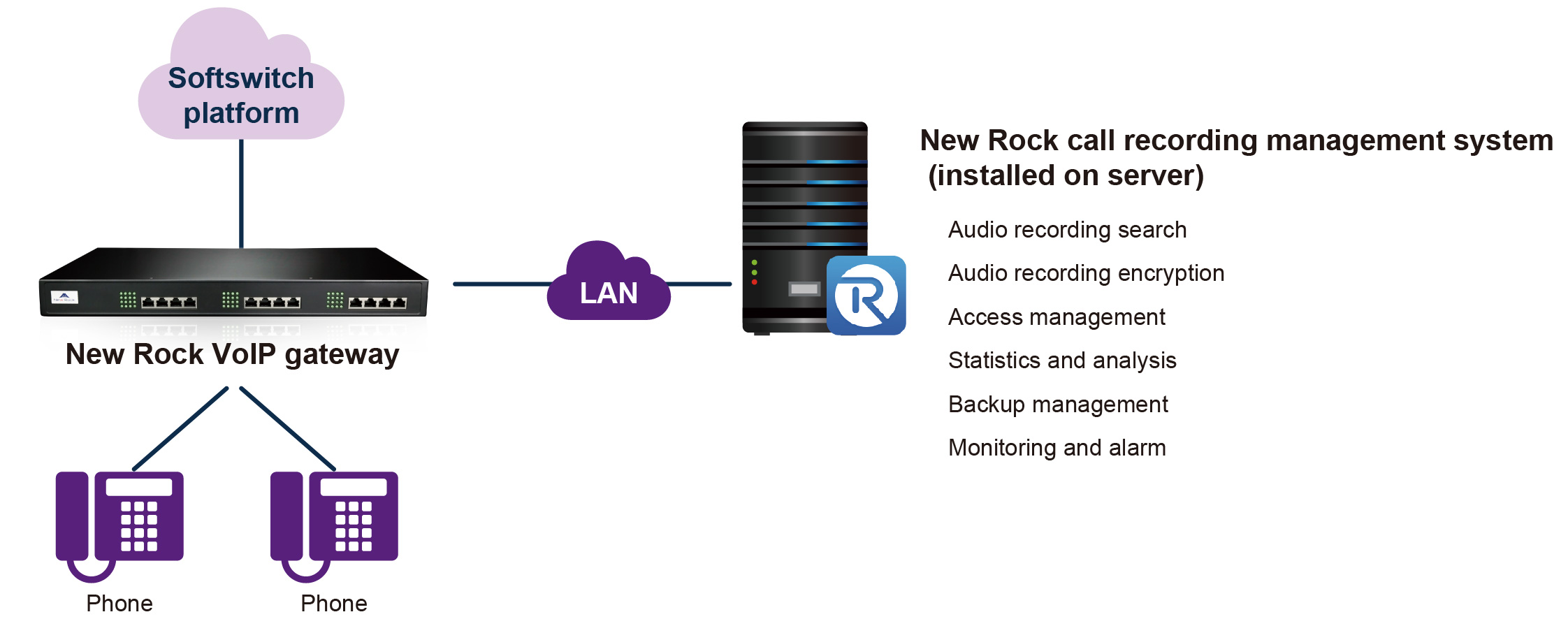 The New Rock VoIP gateway supports the standard SIP protocol and is compatible with mainstream soft-switch platforms. All calls through the VoIP gateway are automatically recorded and stored on the server, which can be centrally managed by the New Rock recording management system.