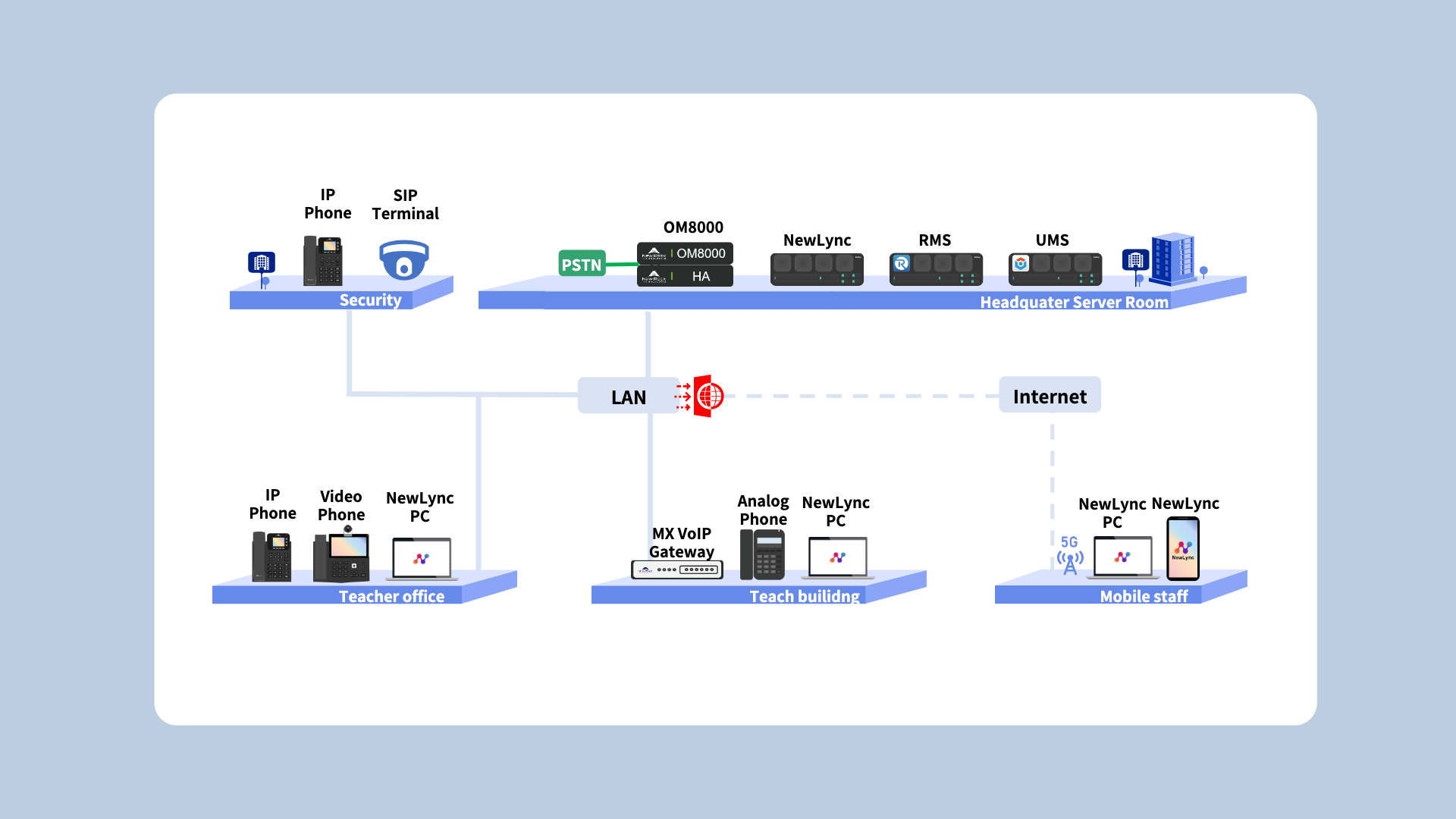 New Rock school distributed telephony deployment solution makes full use of the campus network to integrate the VoIP into multiple locations such as class building, office building, securities, activity areas, effectively reducing the cost of deployment and maintenance of the telephone system.