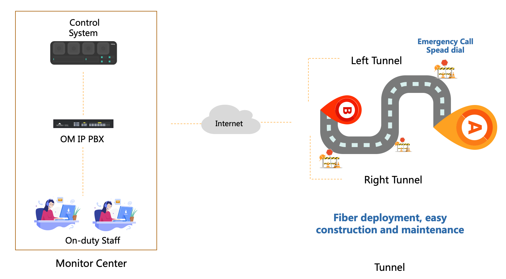 New Rock jointly develop the solution with partners to launch a new generation of integrated systems that integrating emergency telephone intercom and broadcasting, which consists of emergency telephone console (including application control system, OM series IP PBX, on-duty telephone, etc.), transmission fiber optic cable, and emergency telephone branch.