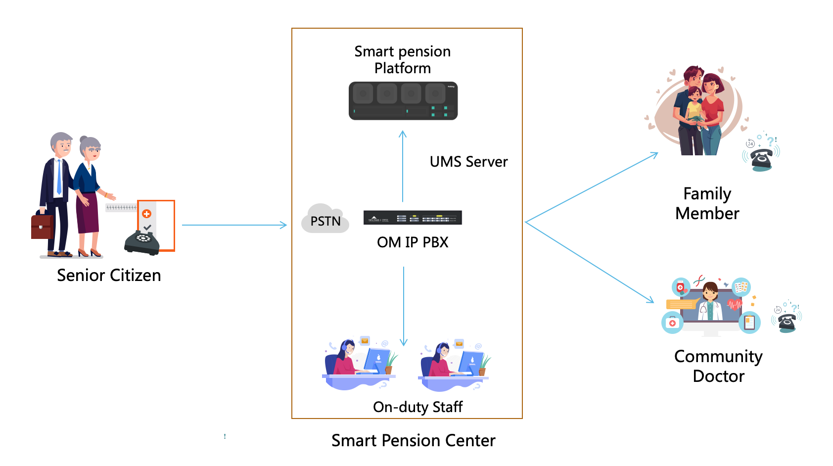 The elderly do not need to dial the number, they can ask for help according to the set shortcut keys, and the service center telephone extension, computer seat end and cell phone client can answer, and the client can realize the automatic pop-up screen for incoming calls.