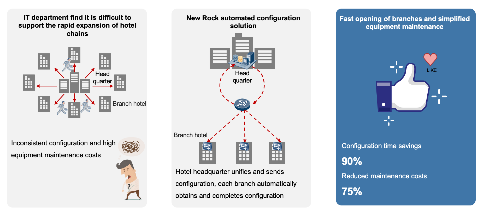 Inconsistent configuration and high equipment maintenance costs make the hotel IT department find it is difficult to support the rapid expansion of hotel chains. New Rock hotel VoIP solution provides an auto-configuration function that allows hotel headquarters to unify configuration management, each branch can automatically obtain and completes the configuration.